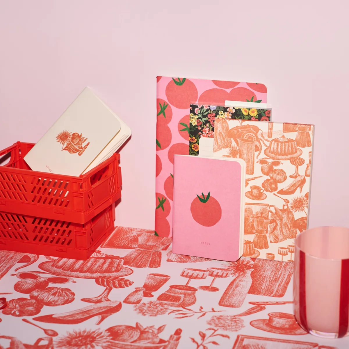 Sous sa couverture à motif, notre calepin dévoile un grand aplat coloré et 75 pages vierges détachables en papier à base d’épluchures d’agrumes. De quoi écrire tous vos penses-bêtes, mémo et autres idées pour ne plus jamais rien oublier ! Une scène de la vie quotidienne. La table de la cuisine, remplie du bazar de la vie. Dans cette composition classique au premier regard, au milieu de la vaisselle, d’un gâteau de fête, de fleurs coupées et de fruits, se sont glissés des objets (pas si) anodins, comme un clin d’oeil aux films de Pedro Almodovar. Dessiné au crayon rouge, notre motif La vida mettra son grain de folie sur le bureau.