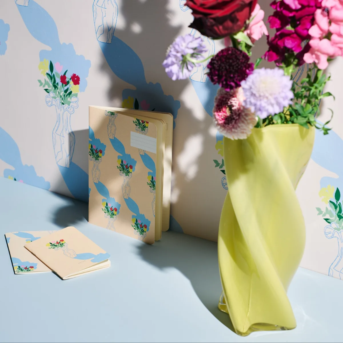 Un sujet classique répété en boucle, une composition qui redessine sans fin la nature morte, notre motif Heure dorée met en scène un vase, un bouquet d’oeillets, une ombre bleue, puis deux, puis trois, puis quatre… Notre carnet fleuri accueillera toutes vos notes, croquis et pensées ! Posé sur votre bureau ou glissé dans votre sac, il deviendra vite un indispensable.